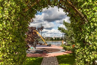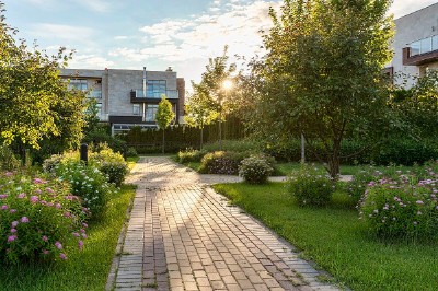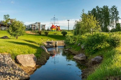 The project boasts a landscaped green area with walking alleys, rotundas, flower beds, and fountains. The Belyana River marks the settlement’s boundary, offering privacy and tranquility amid spruce, linden trees, and decorative shrubs.