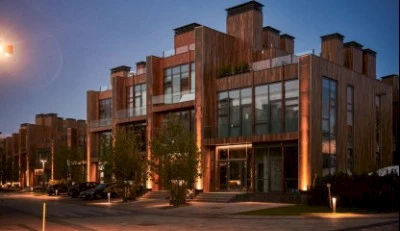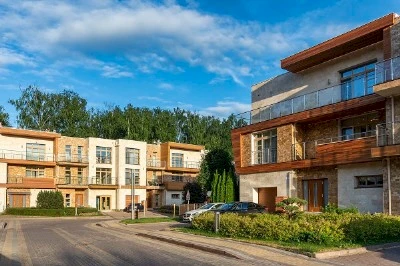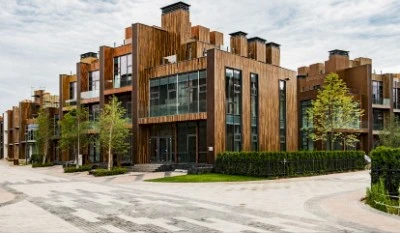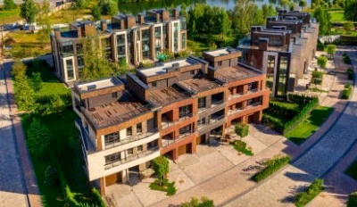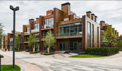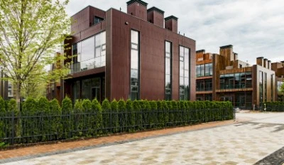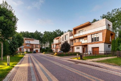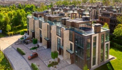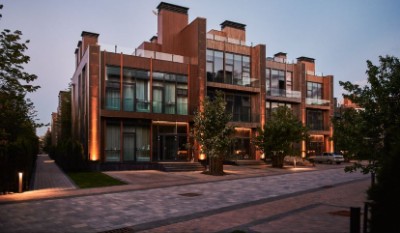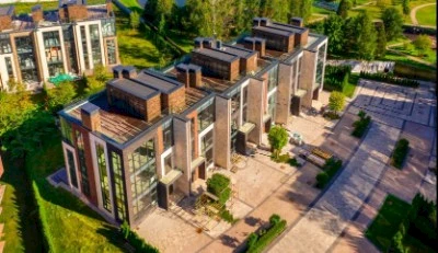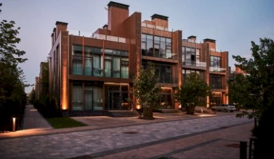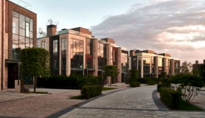 The village features 182 townhouses ranging from 278 to 310 m², designed in a cohesive style that combines Scandinavian minimalism and modern urbanism. Homes include panoramic glazing, terraces, and rooftop access.