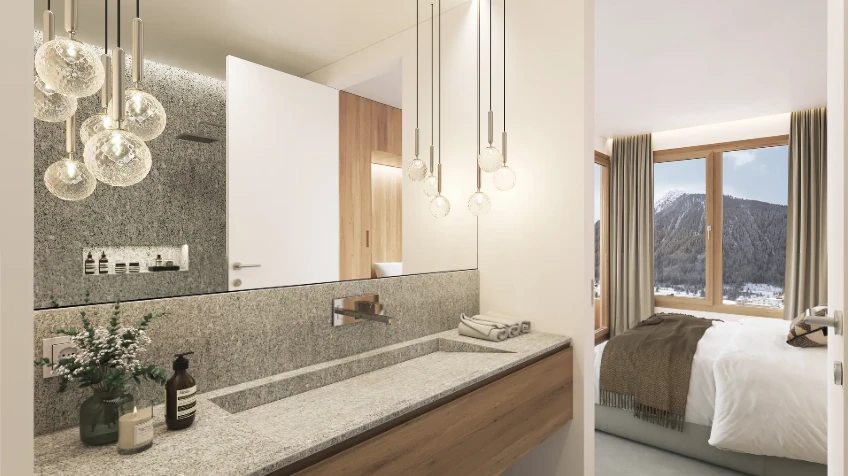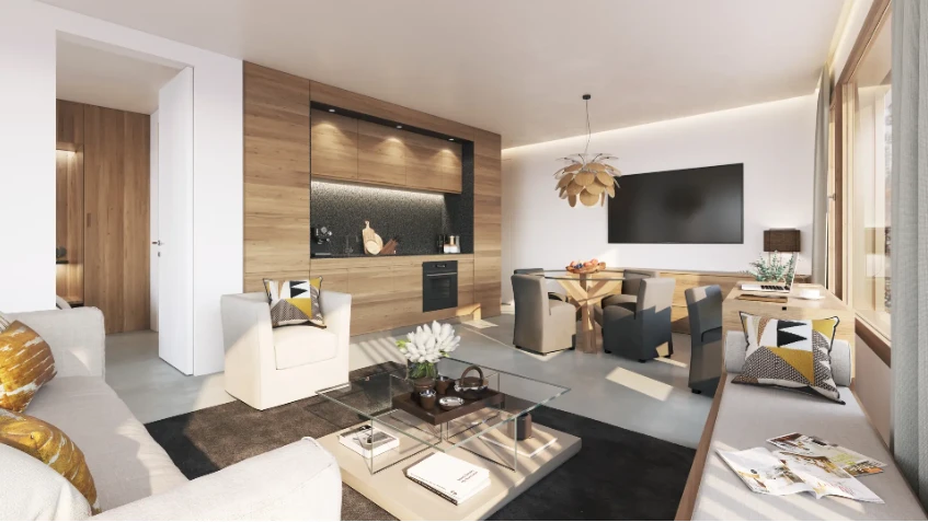 The buildings are designed in a minimalist alpine style, where clean architectural lines are softened by the warmth of natural materials — wood, stone, and glass. Panoramic windows provide abundant natural light and breathtaking views of the Davos mountain landscapes. The interiors combine modern aesthetics, functional layouts, and premium materials to create a space of comfort, openness, and harmony.