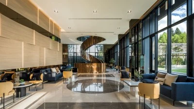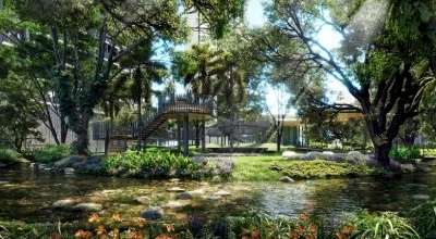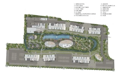The architectural concept of the project is inspired by nature and the flow of the river, with the grounds divided into four thematic zones that bring together more than thirty facilities. Gardens and quiet relaxation corners, modern sports areas, and social spaces form a harmonious environment where four conceptual zones come together—sky, forest, valley, and river.