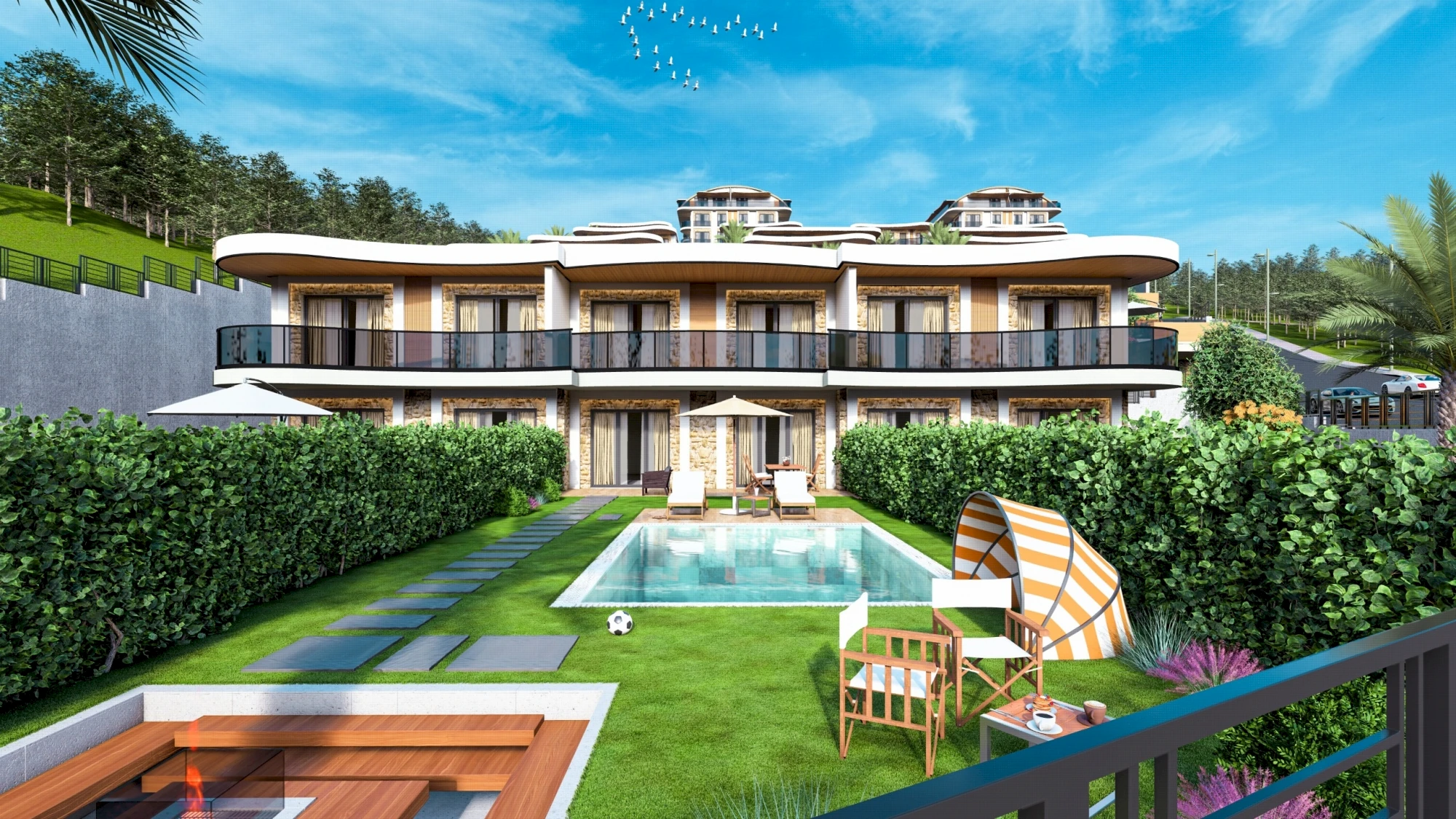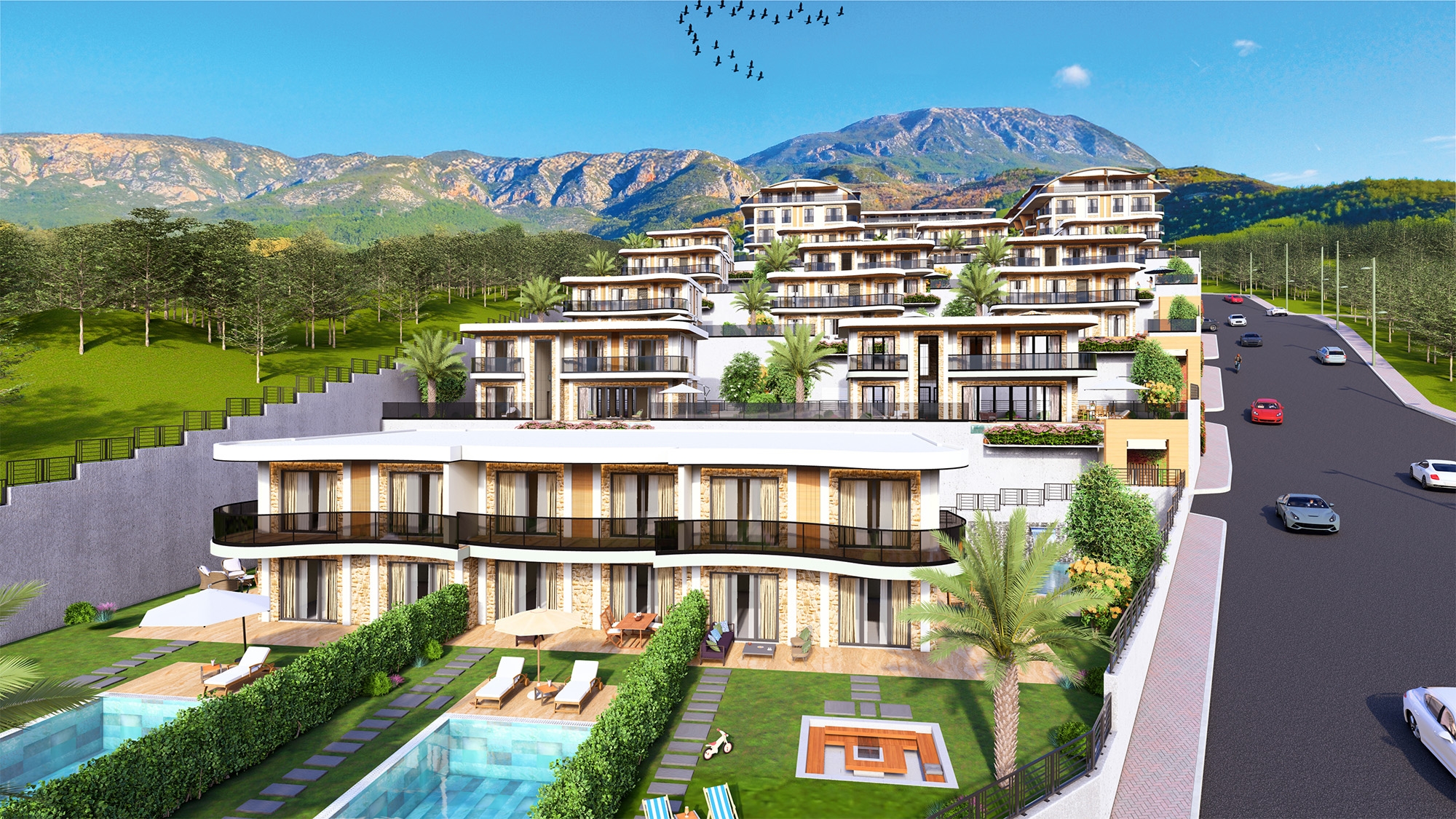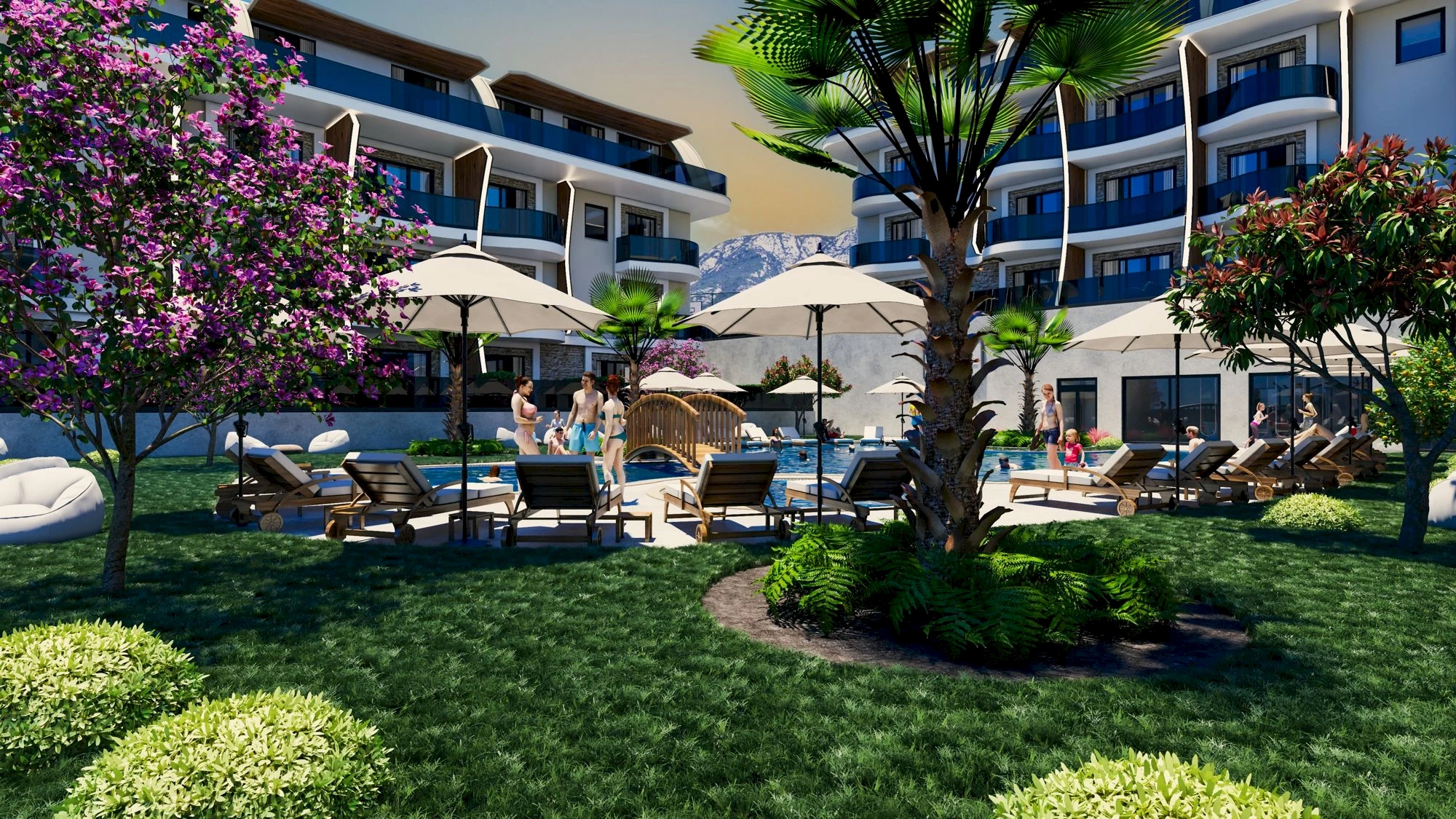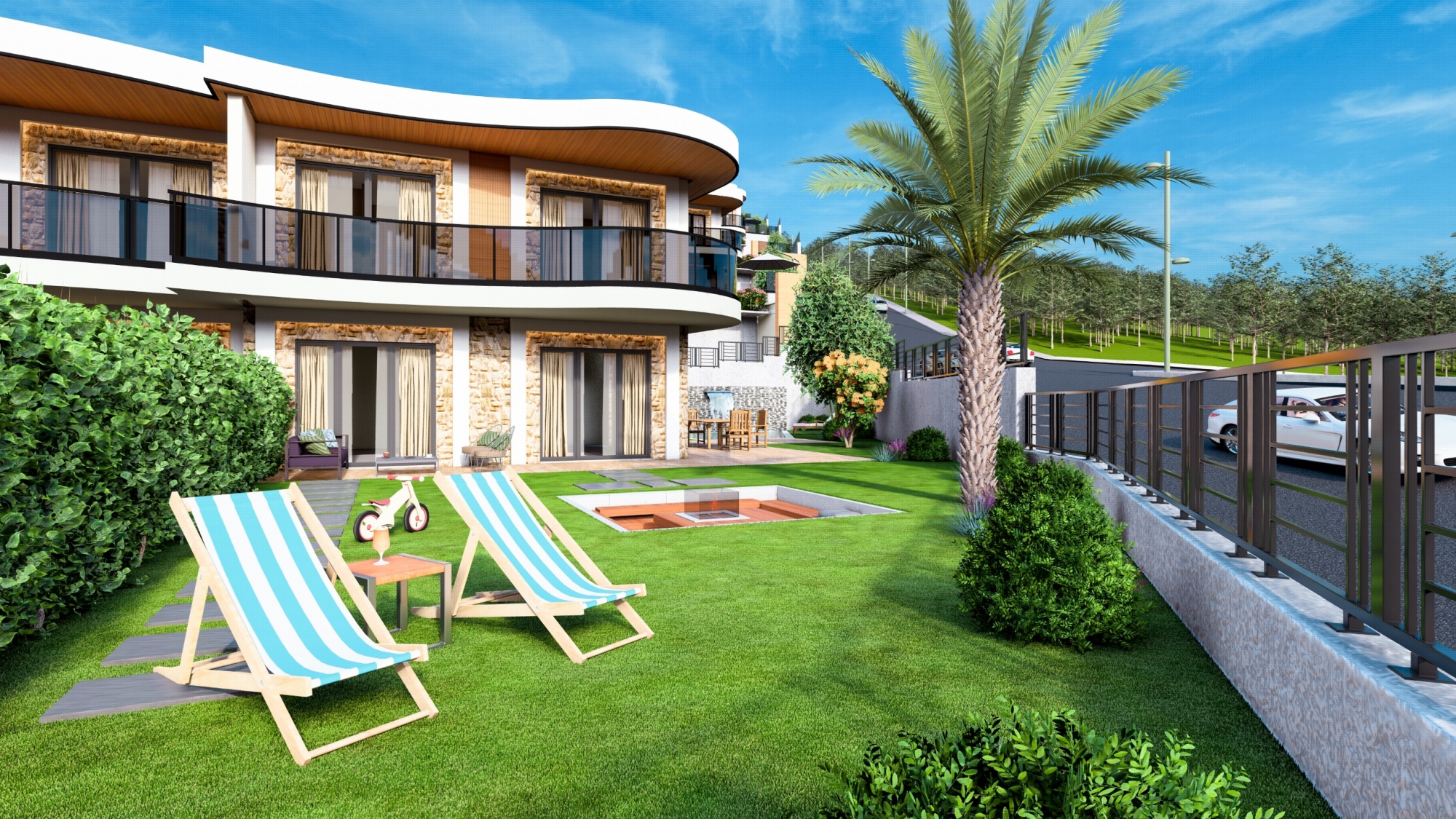 The garden duplexes feature private, fully enclosed plots ranging from 58 to 195 m². 85% of the apartments offer views of Alanya city center, the castle, and the sea.