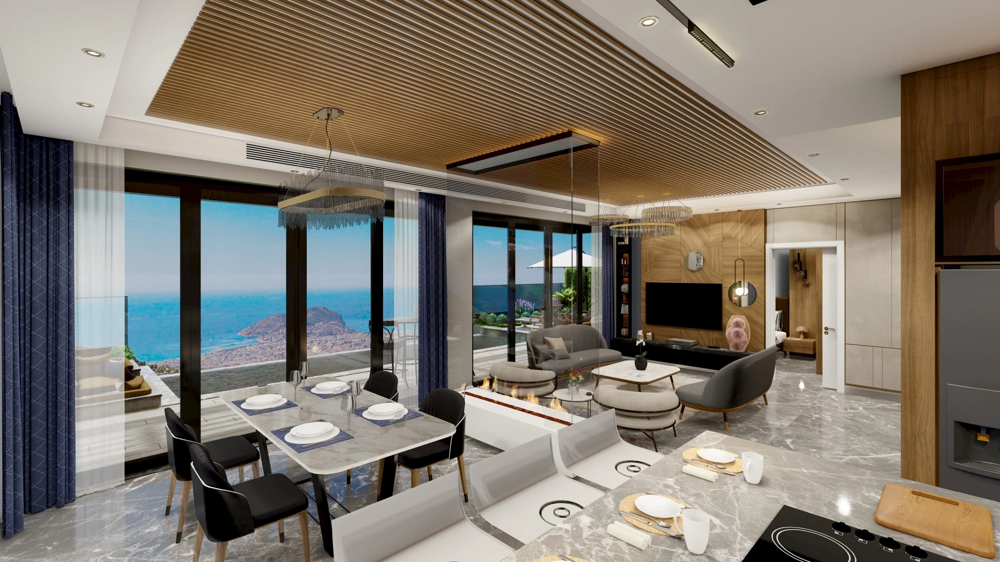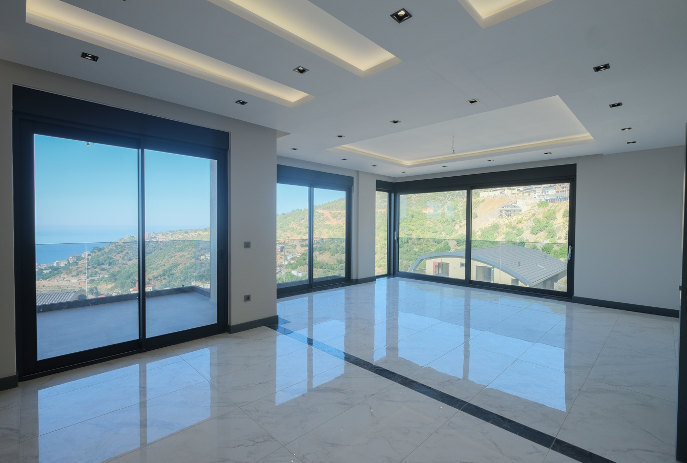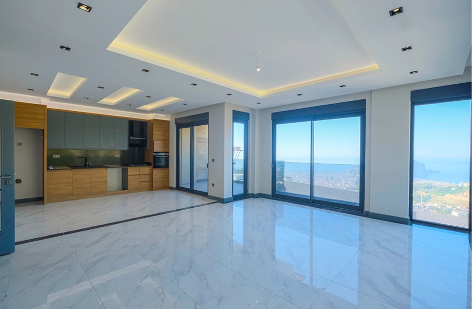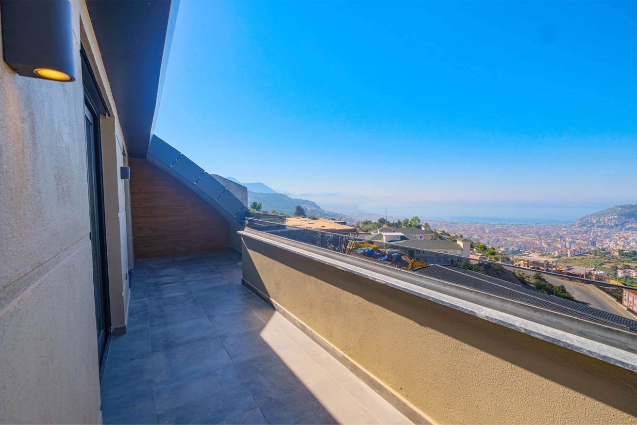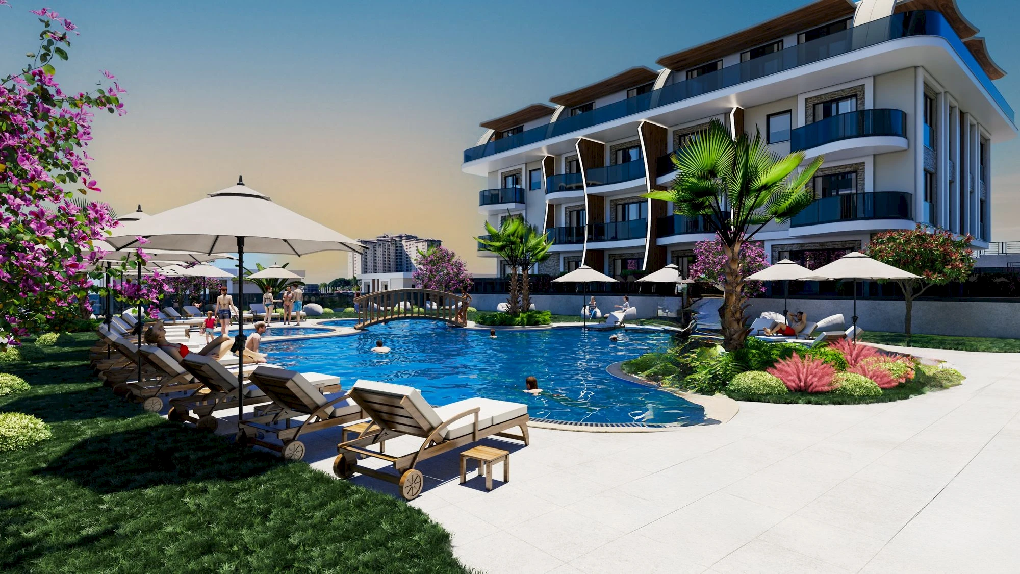 The garden duplexes feature private, fully enclosed plots ranging from 58 to 195 m². 85% of the apartments offer views of Alanya city center, the castle, and the sea.