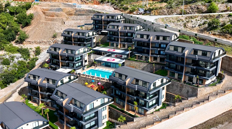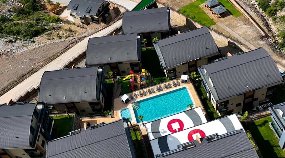 The complex was built in 2024 on a plot of 8,539 m² and is ideal for peaceful living and relaxation. It is located in a quiet residential area with nearby walking trails and sports facilities. The center of Kargicak is a 30-minute walk, local shops and services are 10 minutes away, the nearest beach is 30 minutes on foot, and Gazipasa-Alanya Airport is a 25-minute drive. The surroundings are characterized by lush greenery and a serene atmosphere with minimal traffic.