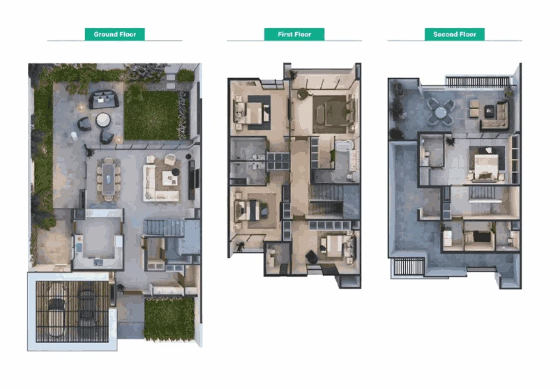 The properties range in size from 613 to 2,393 square meters and the plots from 360 to 3,510 square meters. The residences are equipped with all the necessary amenities: private swimming pools, landscaped gardens, terraces, staff rooms, elevators and green areas on the roofs. They offer mesmerizing views of the garden or the beach.