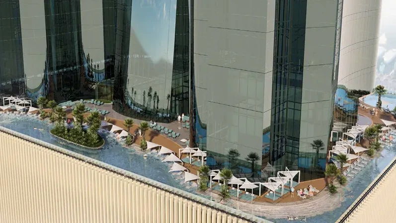 At its heart lies Dubai’s largest leisure deck, spanning 120,000 sq. ft. with pools, gardens, cafés, and lounge areas.