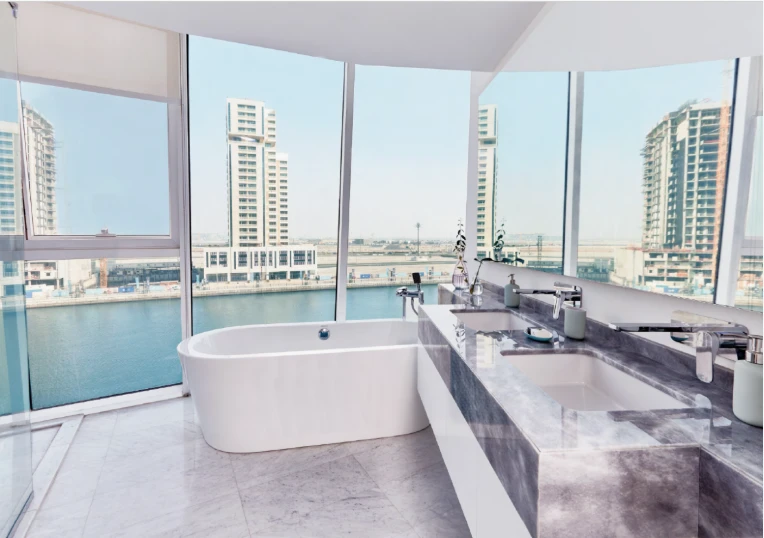 The complex offers many luxurious amenities such as a spacious outdoor pool, private gym and yoga studio, and meeting rooms with a cozy lounge. Spas, sauna and steam rooms are also available for residents and guests, and the complex features an outdoor rooftop pool with gorgeous views of Dubai's famous landmarks.