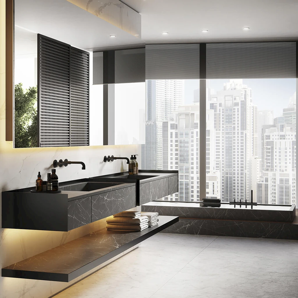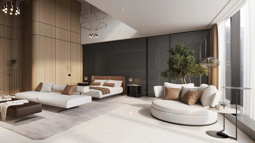 One Palm, located at the beginning of Dubai's largest man-made island, The Palm Jumeirah, embodies a unique architectural design. The interiors of One Palm's residences and penthouses were created by Japanese design firm Super Potato and UK-based Elicyon. Both partners contributed their unique approaches, using different materials and styles to create an amazing combination of textures, colors and designs. The minimalism of the interior harmonizes with the overall concept of the project, emphasizing its uniqueness.