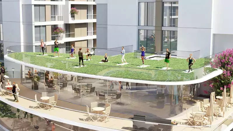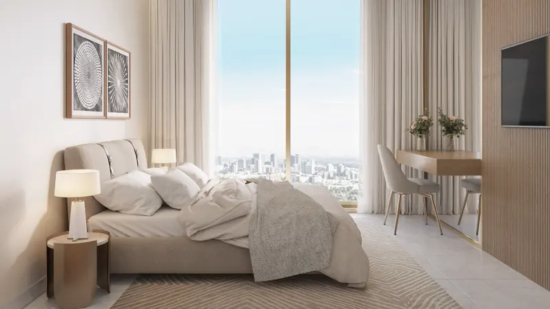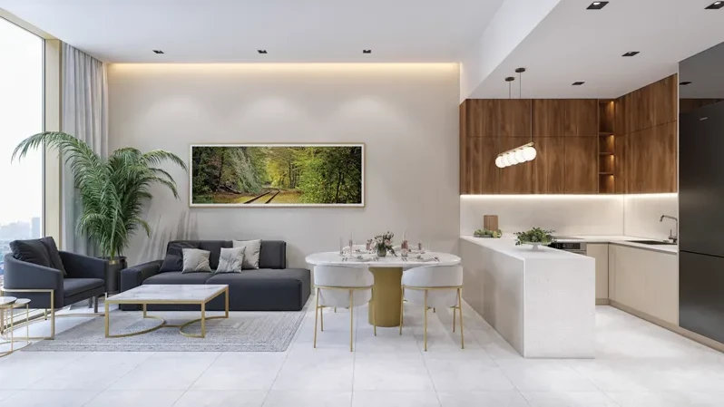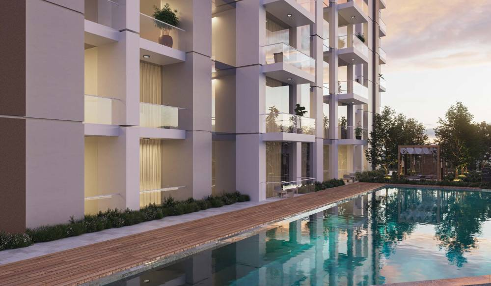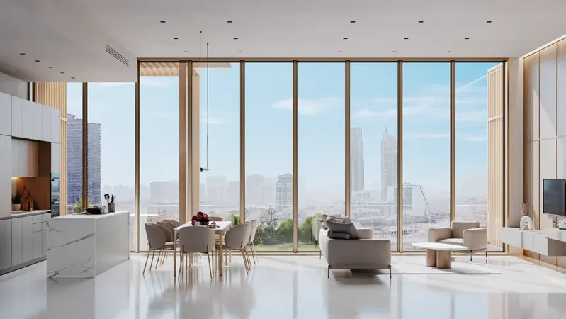 Its modern architecture stands out among other buildings in the community: semi-reflective façades, slender balcony lines, and a monumental podium emphasize the premium nature of the project. Inside the residences, the living spaces are thoughtfully designed, where every detail ensures residents’ comfort: high-quality finishes, panoramic windows with abundant natural light, 3-meter-high ceilings, and fully equipped kitchens provide both comfort and style.