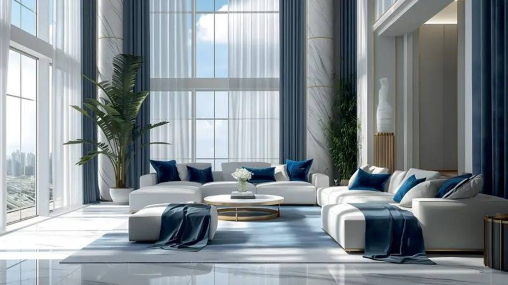 Architectural concept and interiors. Tiger Sky Tower combines a modern structure with elements of Emirati culture. The interiors are designed for luxury living with quality materials and panoramic views of the Dubai skyline.