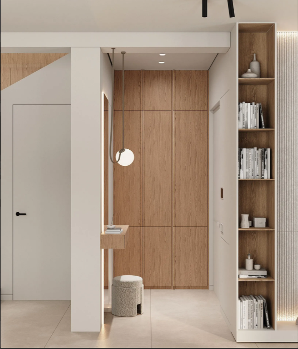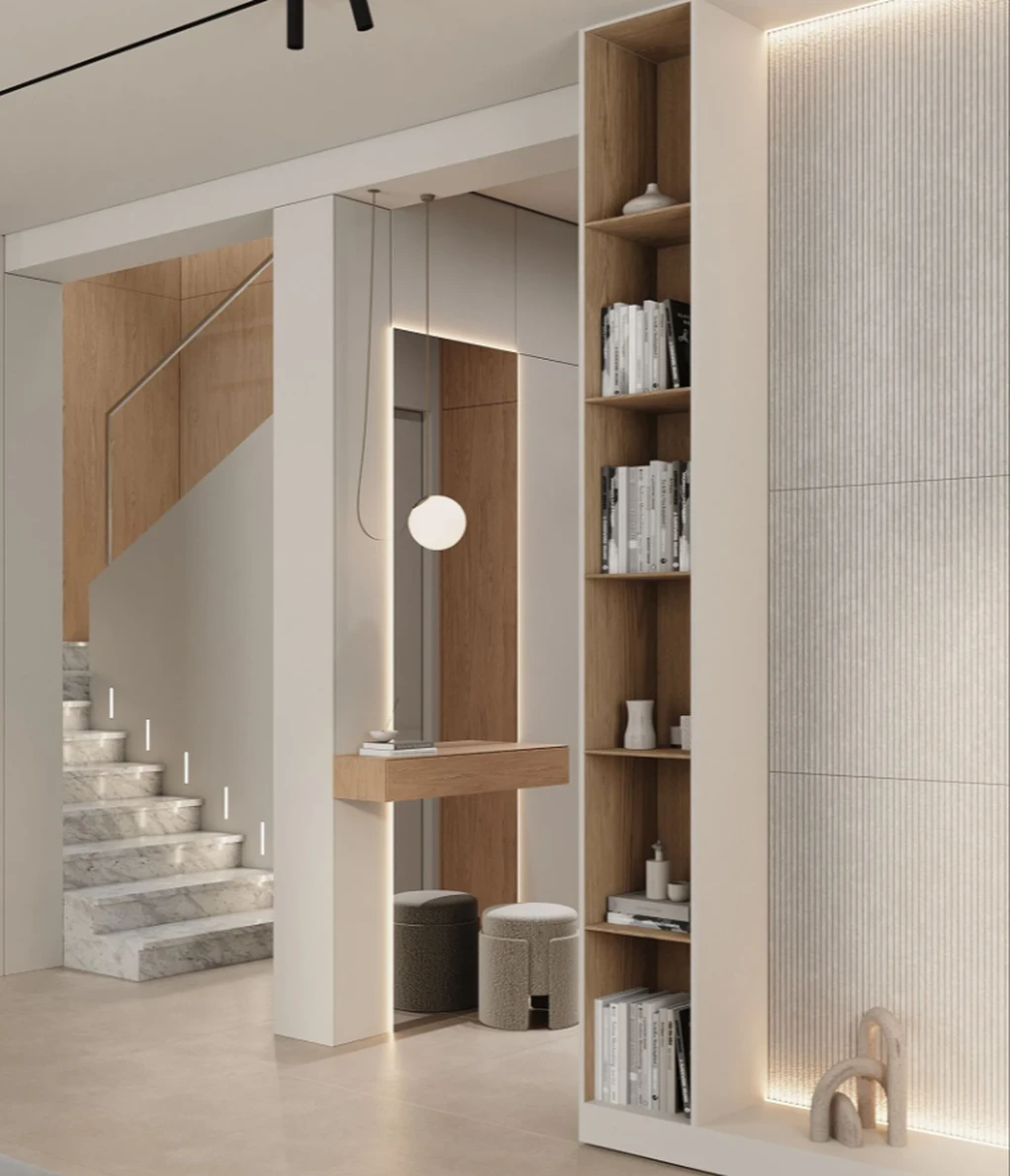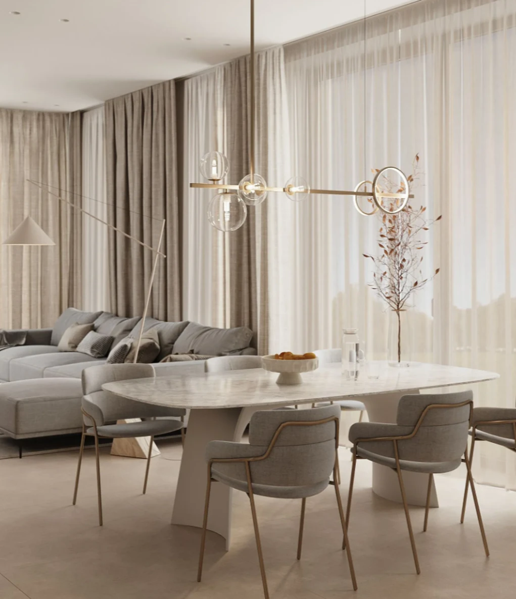 Diseño de interiores por Sence Architects. Espaciosos y luminosos ambientes con ventanales panorámicos, líneas limpias y puertas sin marcos crean una sensación de apertura y armonía.