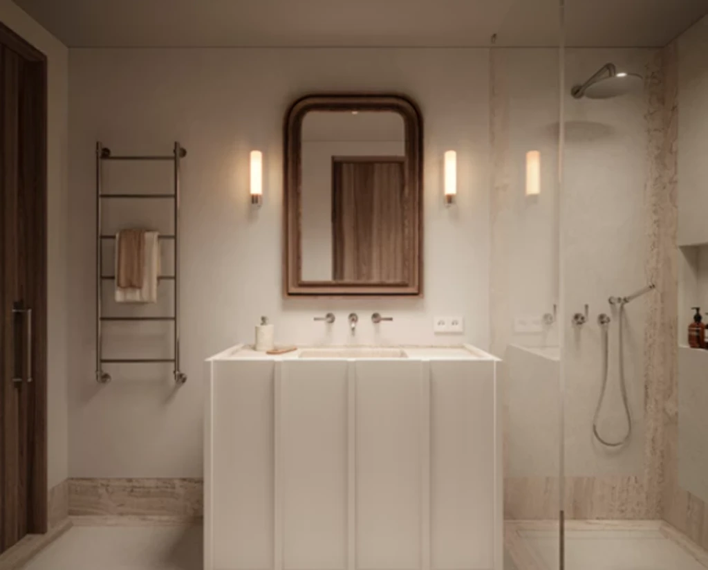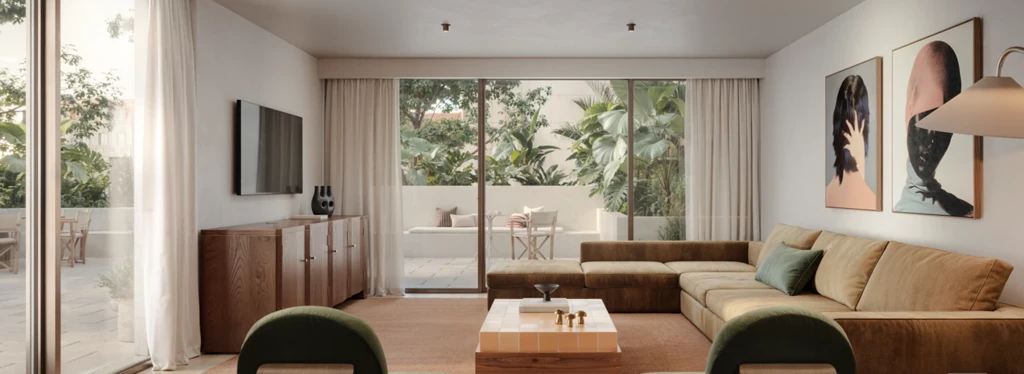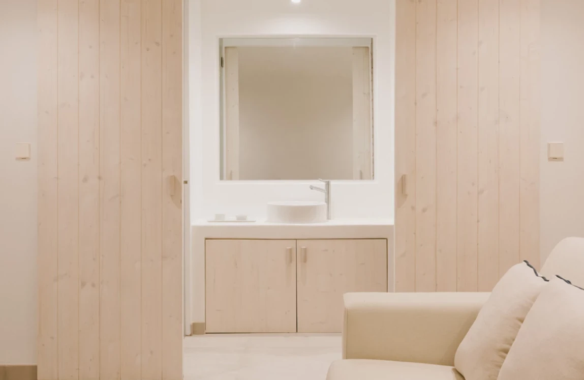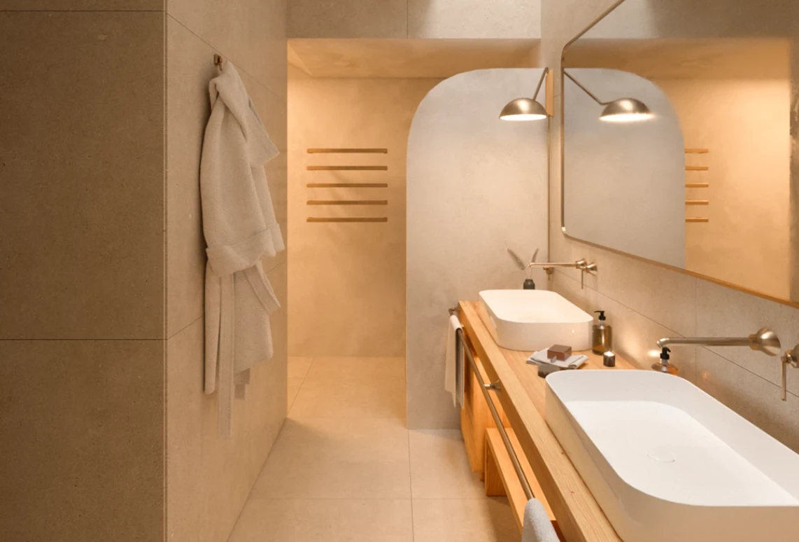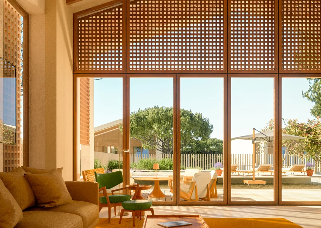 Los interiores, creados por Quiet Studios, destacan por su elegancia atemporal: tonos neutros, materiales nobles —madera, mármol y vidrio— y un mobiliario inspirado en el minimalismo italiano.