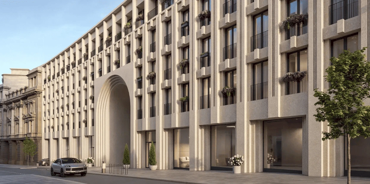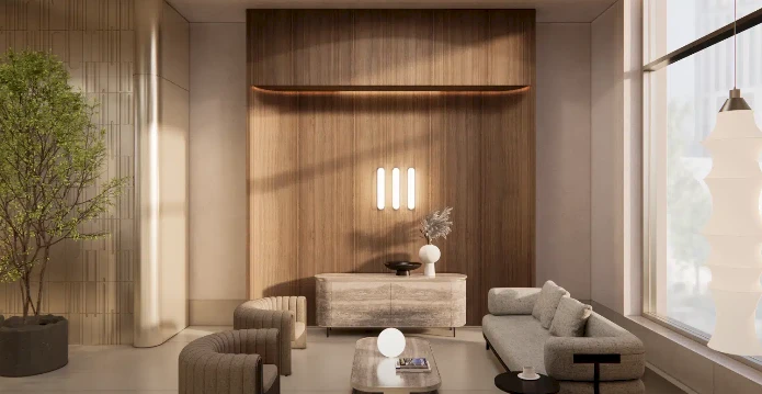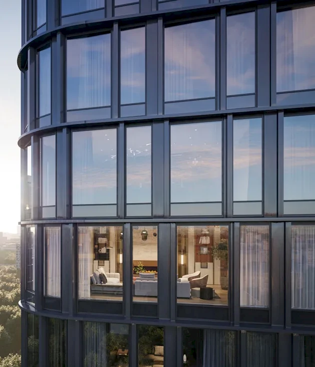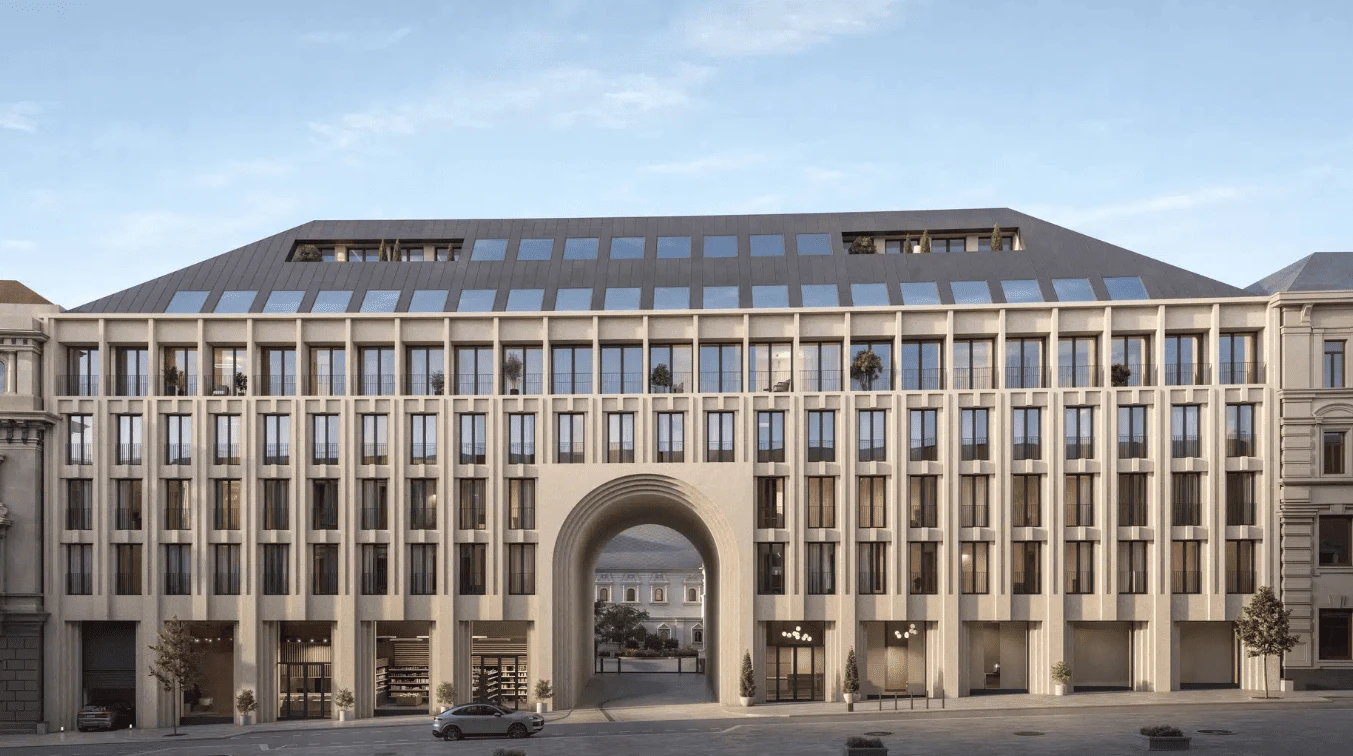 El concepto arquitectónico fue diseñado por el estudio “Genpro”. El contraste en las alturas, las fachadas de piedra y los vitrales arqueados crean una imagen de modernidad elegante. En los vestíbulos y zonas comunes se utilizan materiales nobles como porcelanato, madera, metal y piedra natural. Los techos altos, las ventanas panorámicas y la iluminación suave crean una atmósfera de confort y distinción.