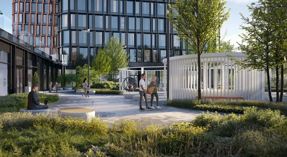 Los tres edificios forman un espacio interior privado con zonas ajardinadas para los residentes: áreas de juegos infantiles, zonas de entrenamiento y áreas lounge con columpios crean una atmósfera de comodidad y privacidad. La seguridad está garantizada por un moderno sistema de control de acceso, y los ascensores rápidos de categoría premium conectan los pisos residenciales con el vestíbulo y el aparcamiento subterráneo.