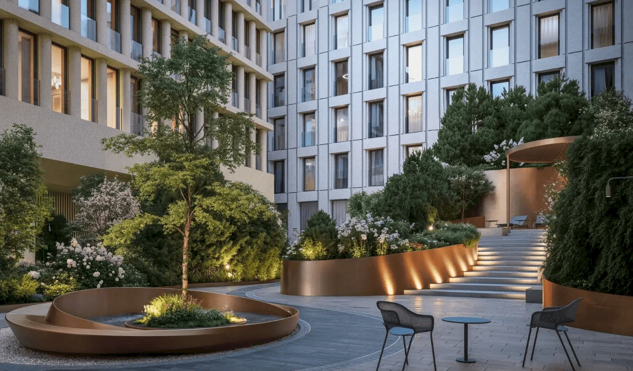 Los interiores, diseñados por el estudio de Oleg Klodt, están disponibles en dos estilos — contemporáneo y neoclásico. El proyecto cuenta con áreas comunes de primer nivel: vestíbulo de mármol, zonas lounge, minibar, coworking y salas de reuniones transformables. En el patio ajardinado con fuente, anfiteatro y plantas exóticas, se ha creado un ambiente de confort y privacidad. Para mayor comodidad, el complejo dispone de un aparcamiento subterráneo con 170 plazas y trasteros. “Rozhdestvenka 8” es la personificación del estatus capitalino, la comodidad y la arquitectura refinada.