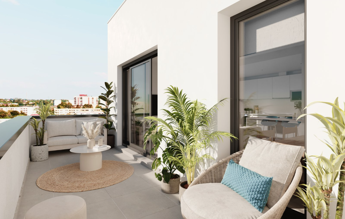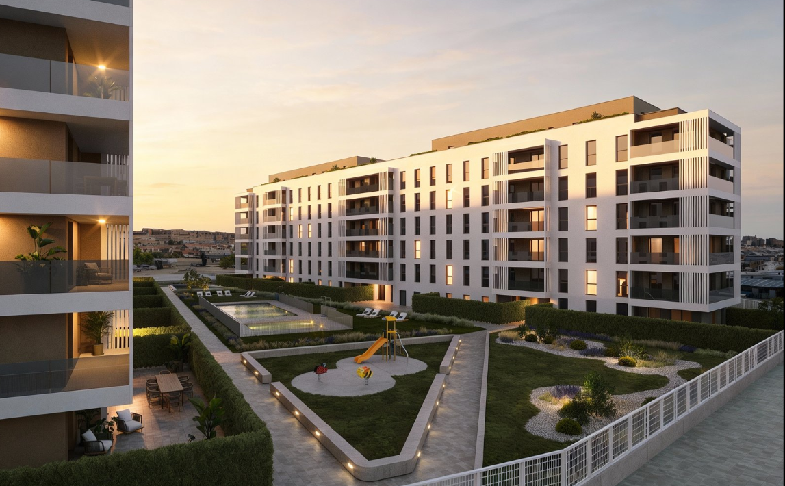El proyecto incluye 115 viviendas de 2, 3 y 4 dormitorios, con la posibilidad de elegir entre áticos de lujo o viviendas en planta baja con jardín privado. Todas cuentan con amplias terrazas, plaza de garaje y trastero.