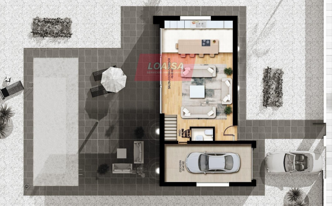La agencia inmobiliaria Loaisa ofrece varios modelos de villas unifamiliares. Puede elegir este diseño, compararlo con otras alternativas o personalizar completamente la distribución según sus preferencias — y seleccionar parcela en ubicaciones como La Cabuzana (Vera), Caporchanes (Vera Playa), Las Salinas de Vera, Los Altos de Mojácar o Huerta Nueva (Los Gallardos).
