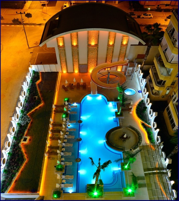 El complejo se encuentra en el centro de Mahmutlar, a solo unos minutos a pie del Mar Mediterráneo. Cerca hay tiendas, supermercados, cafeterías, restaurantes, farmacias y paradas de transporte público, lo que proporciona un acceso conveniente a toda la infraestructura urbana.