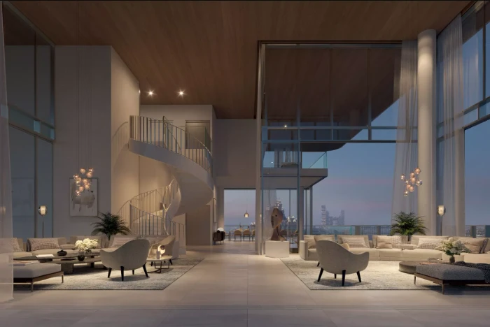 El proyecto incluye apartamentos de 1 a 3 dormitorios, Garden Homes, penthouses de medio piso y un lujoso Presidential Penthouse de más de 15,000 pies². Los interiores de diseño con ventanas panorámicas, cocinas abiertas y muebles premium crean una atmósfera de elegancia y confort.