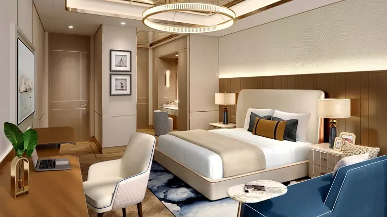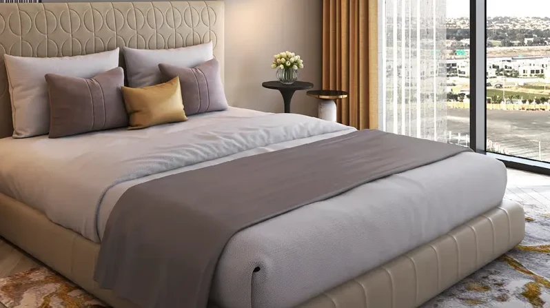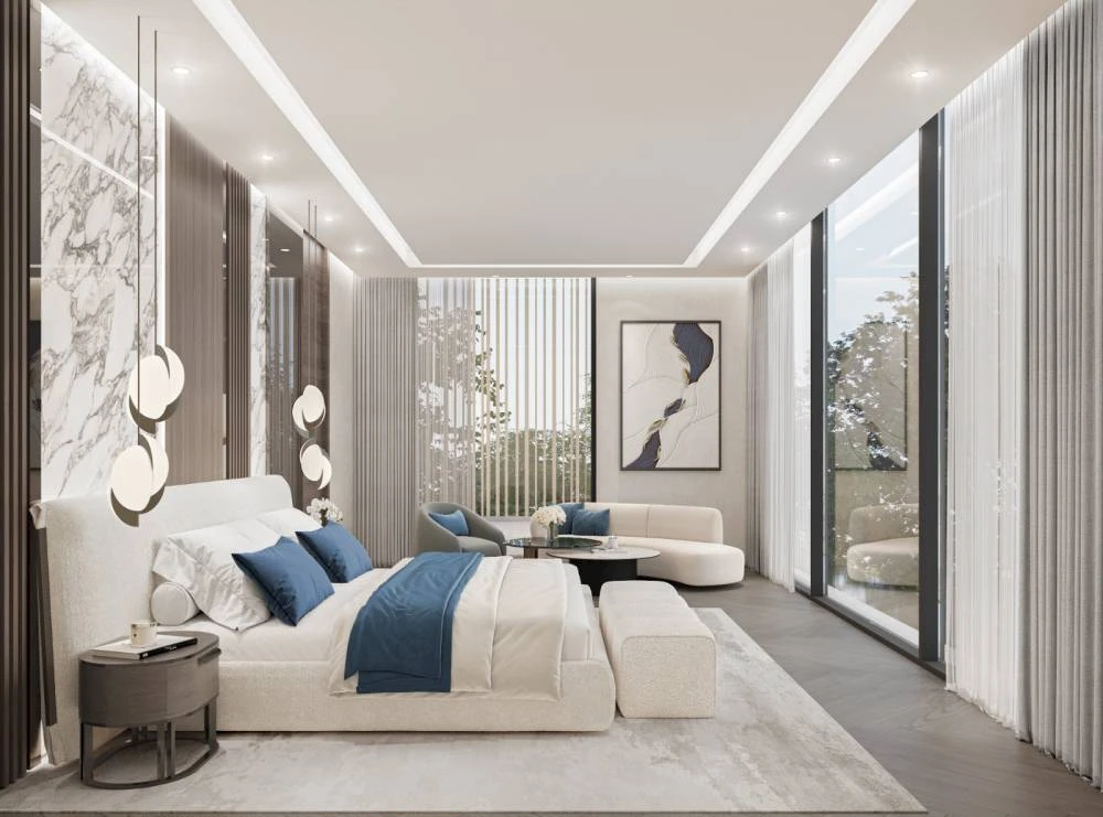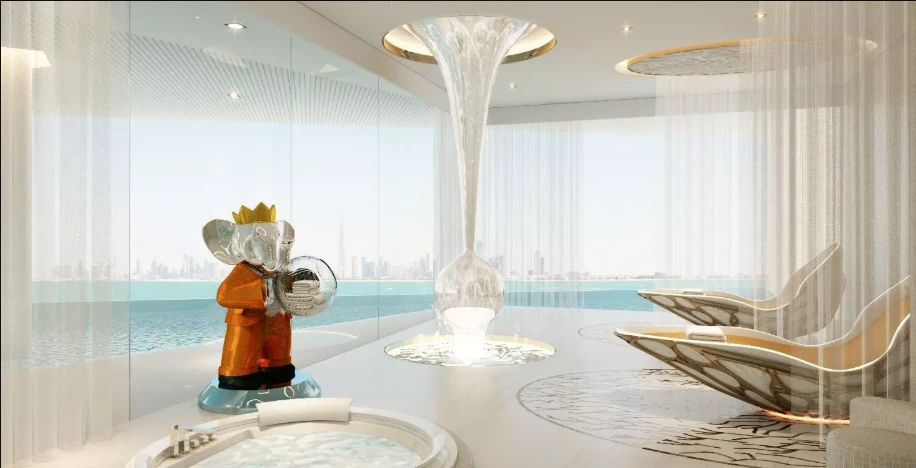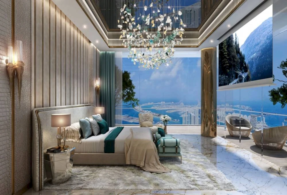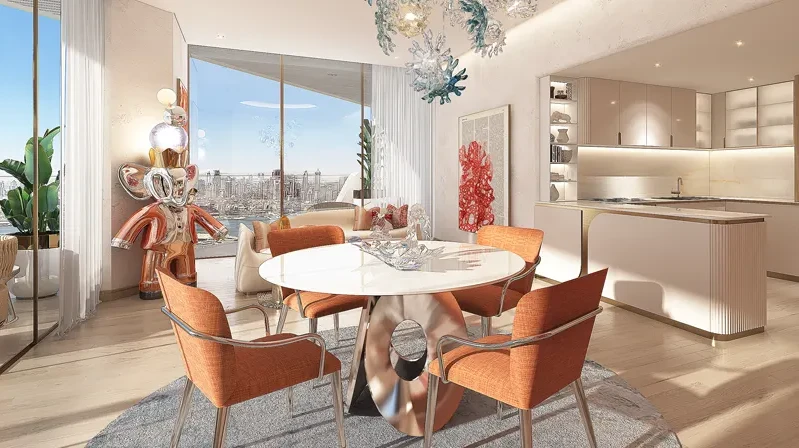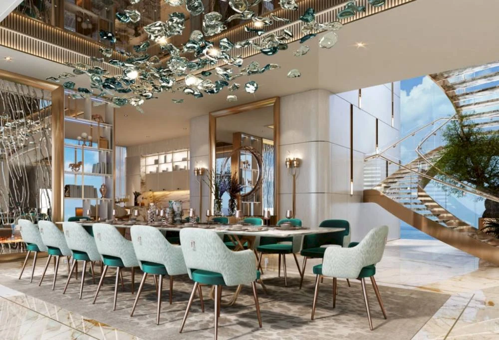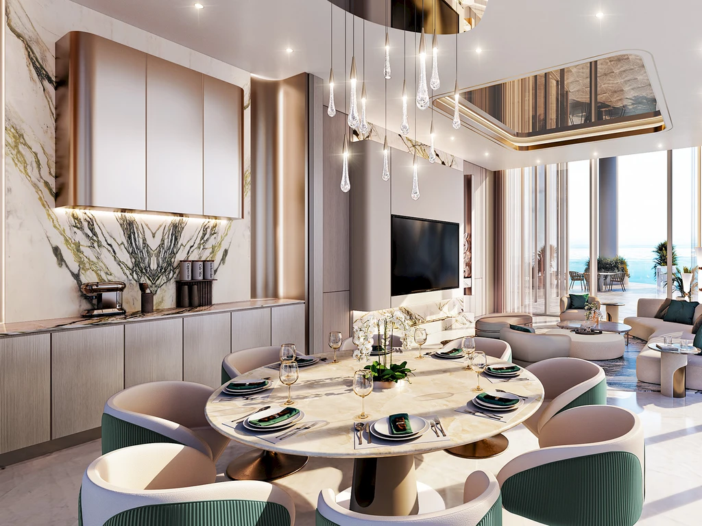 La marca de moda de lujo de GRISOGONO contribuyó al diseño único de estas residencias. Los elegantes detalles en blanco y dorado realzan la sofisticación del interior, mientras que las grandes ventanas panorámicas ofrecen impresionantes vistas del Golfo Pérsico. Gracias a estas ventanas, entra mucha luz natural en el local, creando un ambiente de calidez y confort.