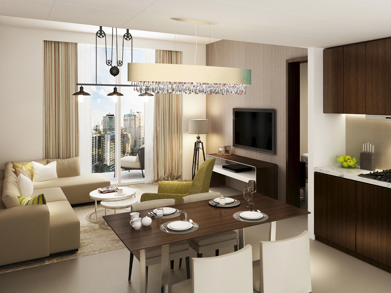Los compradores pueden elegir entre estudios y apartamentos de 1 a 3 dormitorios. Cada residencia tiene una distribución bien pensada y unos interiores exquisitos, realizados con materiales de alta calidad, que enfatizan la singularidad del entorno de vida.