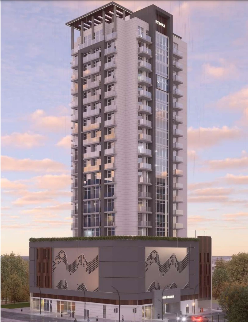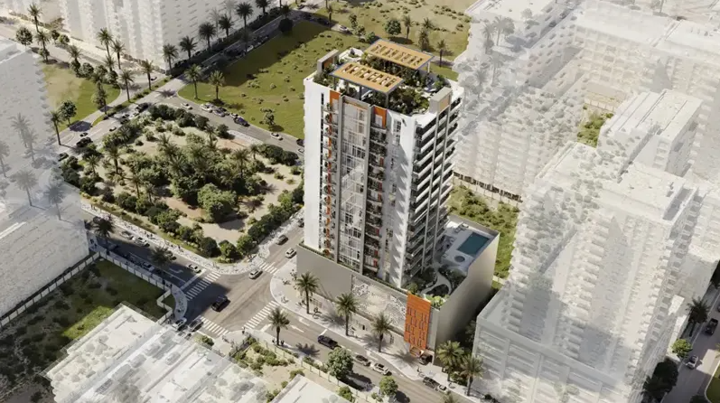 Los interiores incluyen pisos de roble, ventanales, encimeras de mármol y muebles personalizados. El proyecto consta de 118 apartamentos en 15 plantas con techos altos y acristalamiento panorámico.