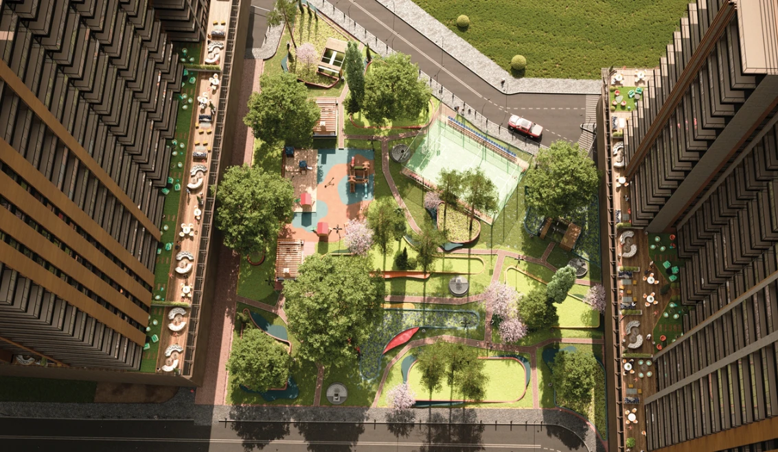 Территория комплекса тщательно благоустроена и озеленена, с применением элементов ландшафтного дизайна. Первые два этажа отведены под офисные и коммерческие помещения. В подъездах установлены скоростные грузопассажирские лифты, а территория двора и общие зоны оснащены камерами видеонаблюдения, обеспечивающими безопасность круглосуточно. Для автовладельцев предусмотрен современный подземный паркинг, а въезд во двор оборудован шлагбаумом.