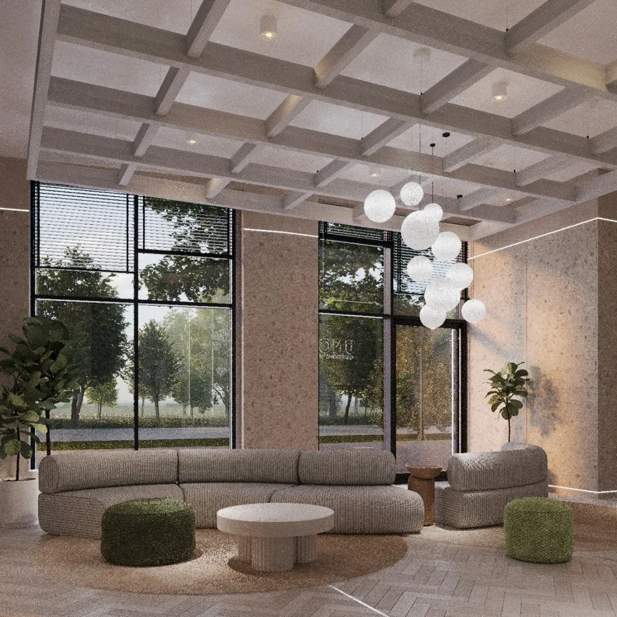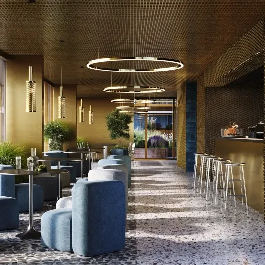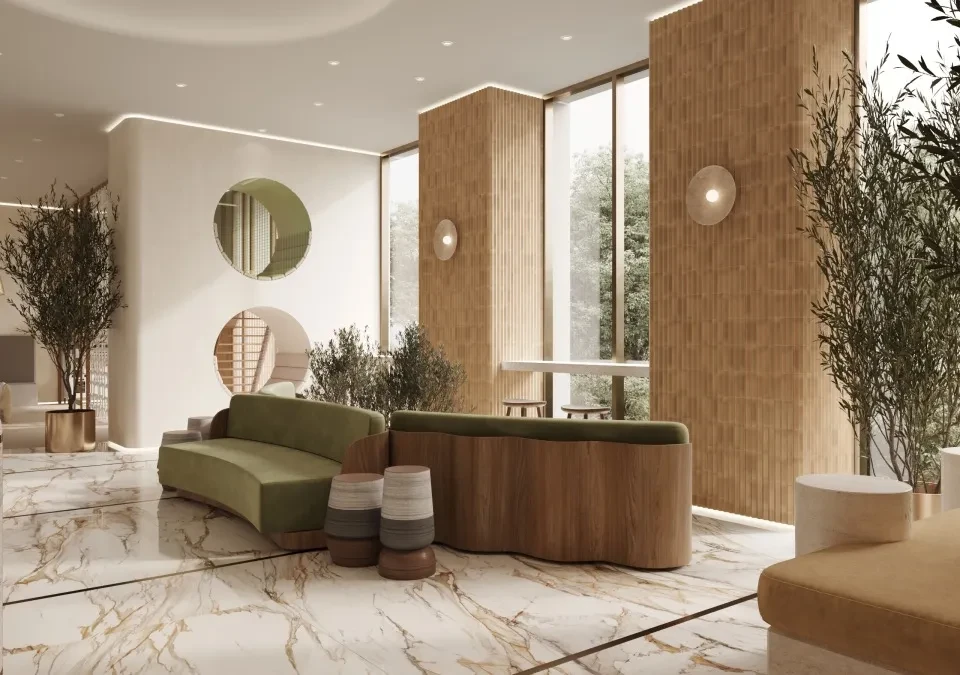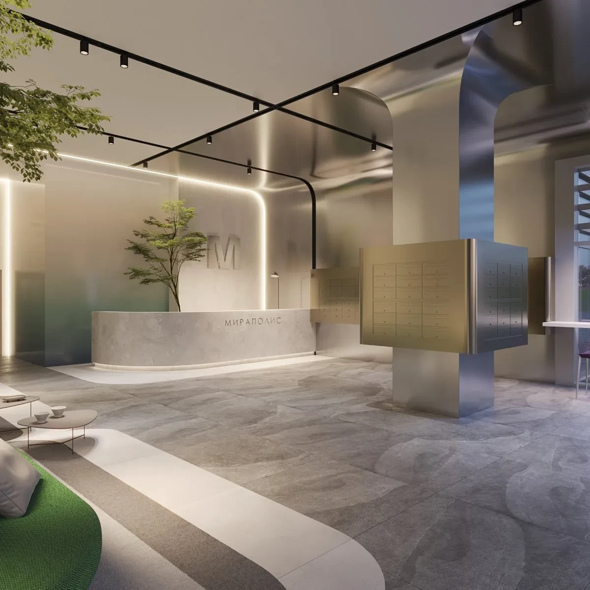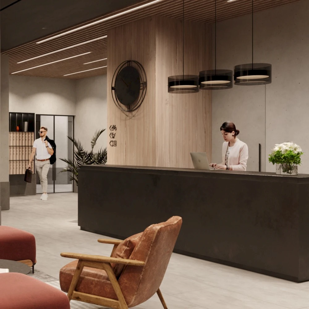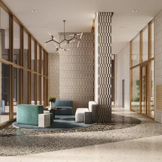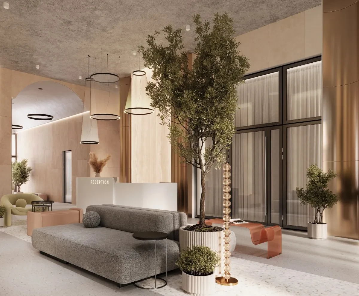 Входные группы и общественные зоны выполнены в современном дизайнерском стиле. Особое внимание уделено созданию комфортной атмосферы для жителей, включая функциональные общественные пространства и зоны для отдыха.