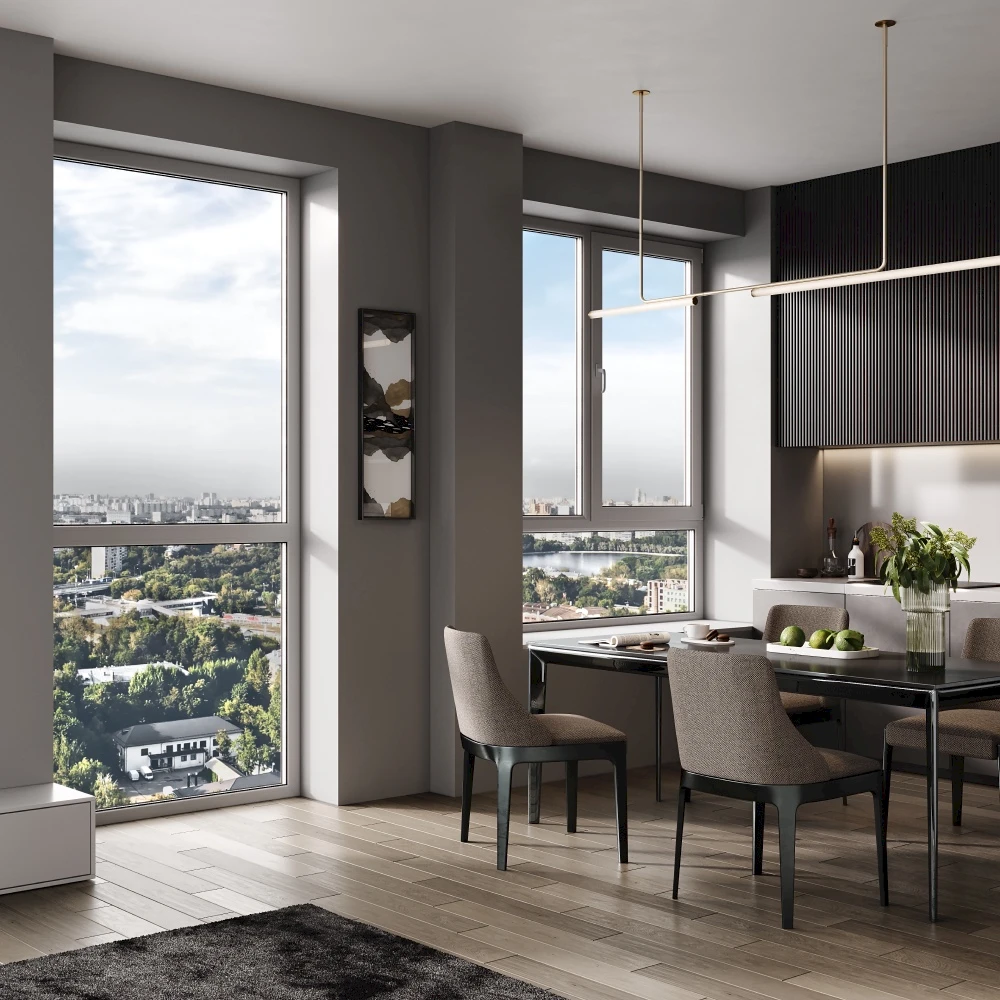 Архитектурное решение акцентирует внимание на гармоничном сочетании функциональности и эстетики, с просторными планировками, большими окнами и продуманной внутренней эргономикой.