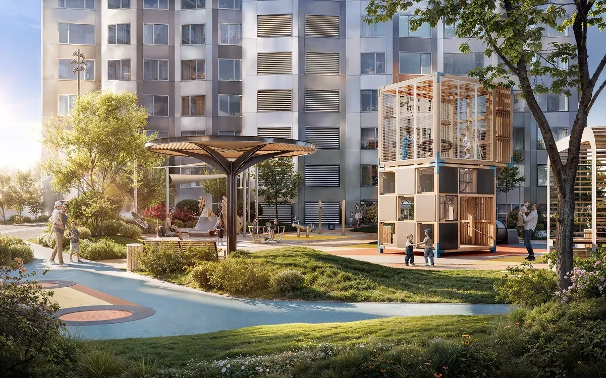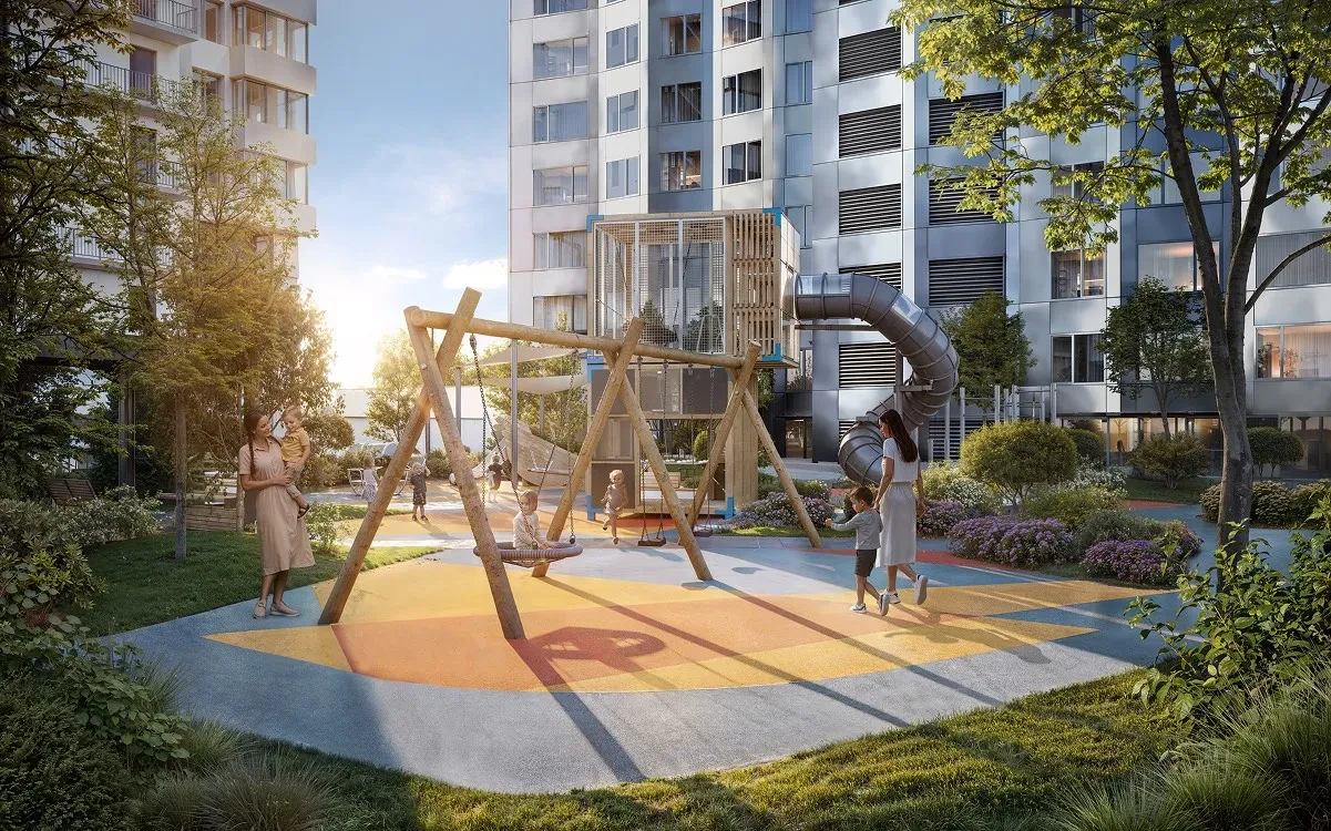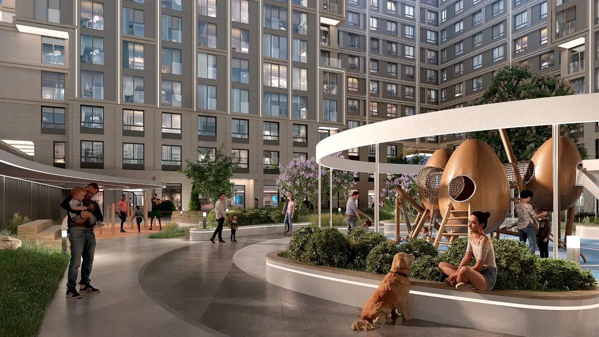 На территории комплекса предусмотрены благоустроенные дворы, прогулочные аллеи, детские и спортивные площадки, зоны отдыха и рекреации, создавая безопасное и комфортное пространство для жителей всех возрастов.