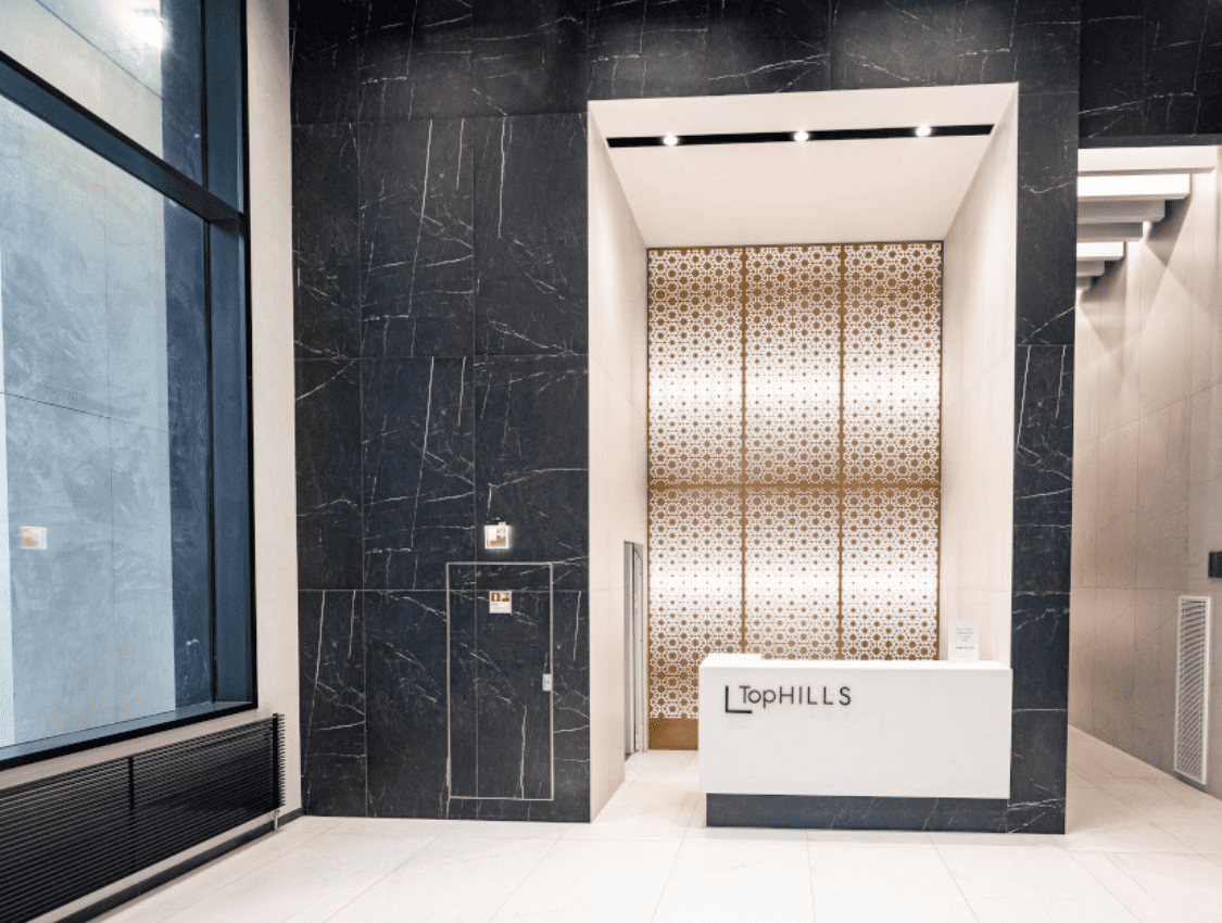 TopHills — это жилой квартал, где архитектура прошлого встречается с ритмом современной жизни. Вдохновлённый нью-йоркскими небоскрёбами 1930-х и монументальностью сталинского ампира, он сочетает устойчивость, элегантность и динамику. Основание башен облицовано керамогранитом тёплых оттенков, средние этажи — чередующимися светлыми и тёмными панелями, создающими игру теней, а верхние завершаются выразительными вертикальными акцентами на фоне бронзовых алюминиевых деталей.