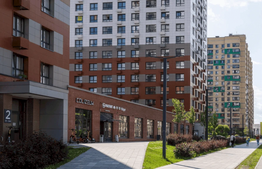 На первых этажах домов расположены кафе, магазины и услуги для повседневных нужд.