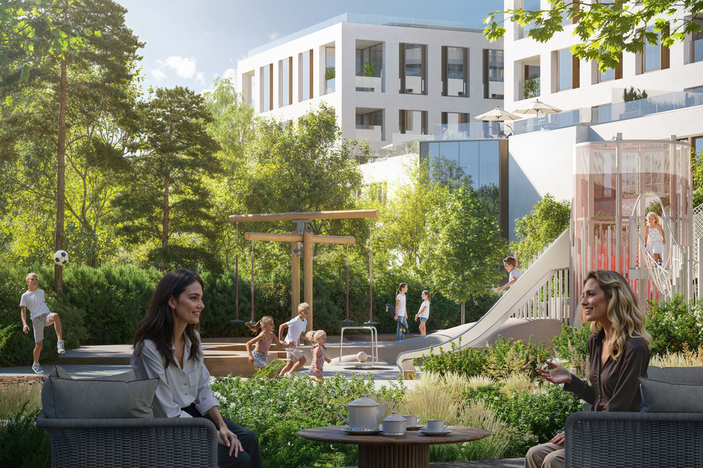 Одним из ключевых элементов проекта является частный двор-парк площадью около 1,4 гектара, созданный специально для жителей комплекса. Пространство включает прогулочные аллеи, зоны отдыха, элементы ландшафтного дизайна и благоустроенные территории для семейного досуга.