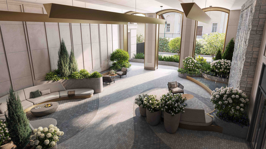 Внутренняя территория комплекса — закрытый двор‑сад площадью более 1 300 м² с зелёными зонами, фонтанами и прогулочными аллеями. Для жителей организованы: