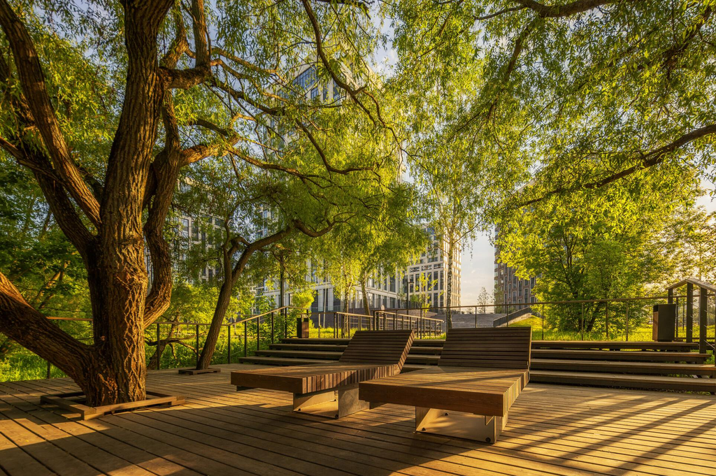 Центральным элементом квартала является приватный парк площадью около 3,1 гектара, включающий прогулочные аллеи, пруды, арт-объекты, спортивные и детские площадки, зоны отдыха и йоги, а также пространства для подростков и домашних животных.