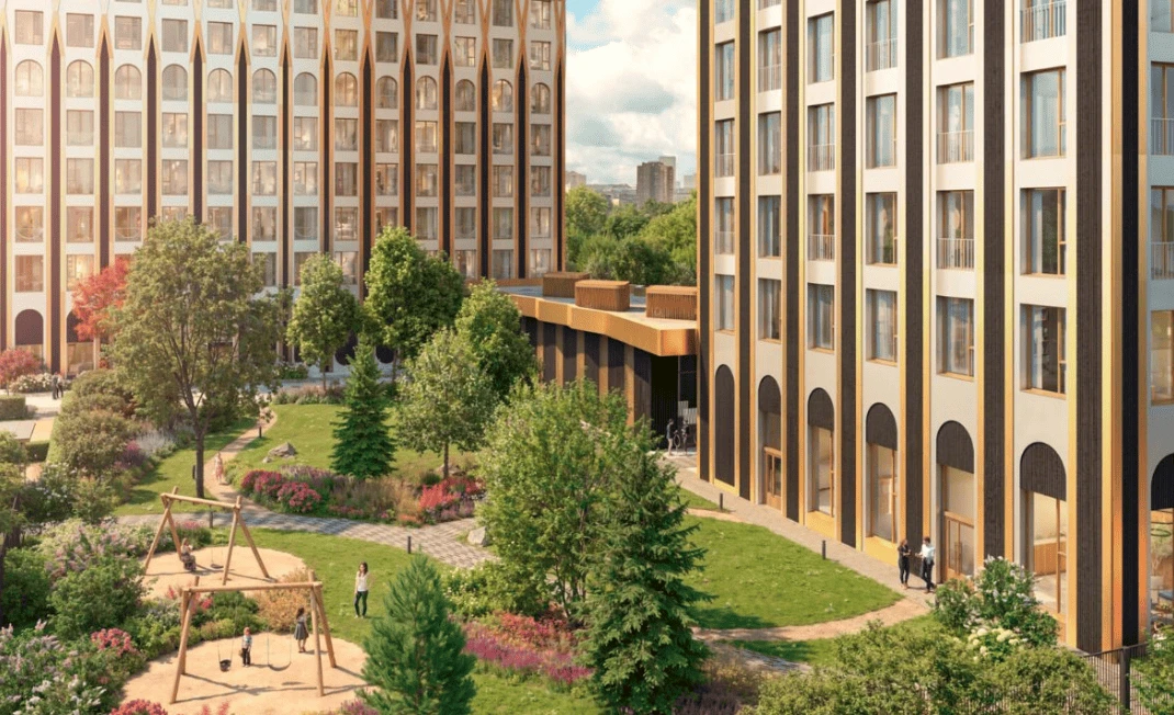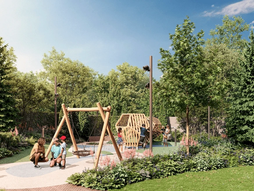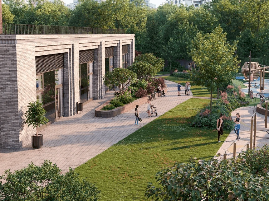 Территория комплекса сочетает урбанистическую динамику и загородный комфорт. Здесь созданы цветущие поляны, зелёный лабиринт, уютные зоны отдыха и современные игровые площадки для детей. Первые этажи корпусов и стилобат отведены под коммерческую инфраструктуру — включая магазины, кафе и сервисные объекты.