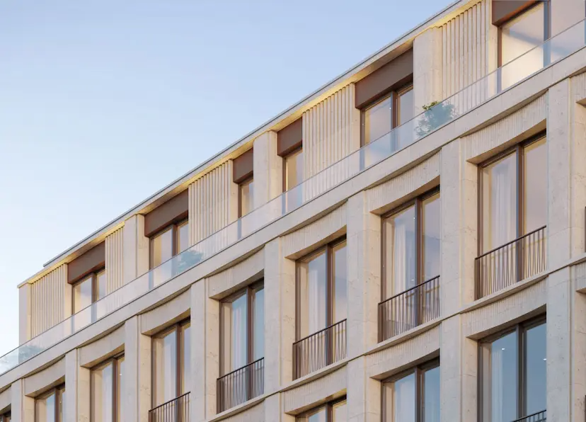 Архитектура комплекса разработана британским бюро John McAslan + Partners, известным своими престижными международными проектами. Фасады выполнены из натурального светлого камня и дополнены панорамными окнами и классическими балконами, что придает зданию элегантный и современный облик, органично вписывающийся в историческую застройку района.