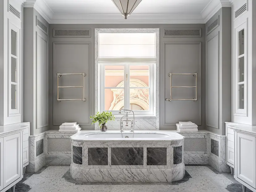 Интерьеры объединяют традиции классической архитектуры с функциональностью современных решений. Использование премиальных материалов и тщательный дизайн создают атмосферу эксклюзивности, стабильности и высокого социального статуса для жителей комплекса.