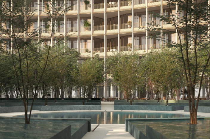 Фасад из модульных железобетонных панелей придаёт комплексу современный и элегантный облик. Проект реализован «под ключ» — от концепции и архитектурного управления до финансового планирования, взаимодействия с подрядчиками и координации строительства, отражая высокий уровень профессиональной экспертизы.